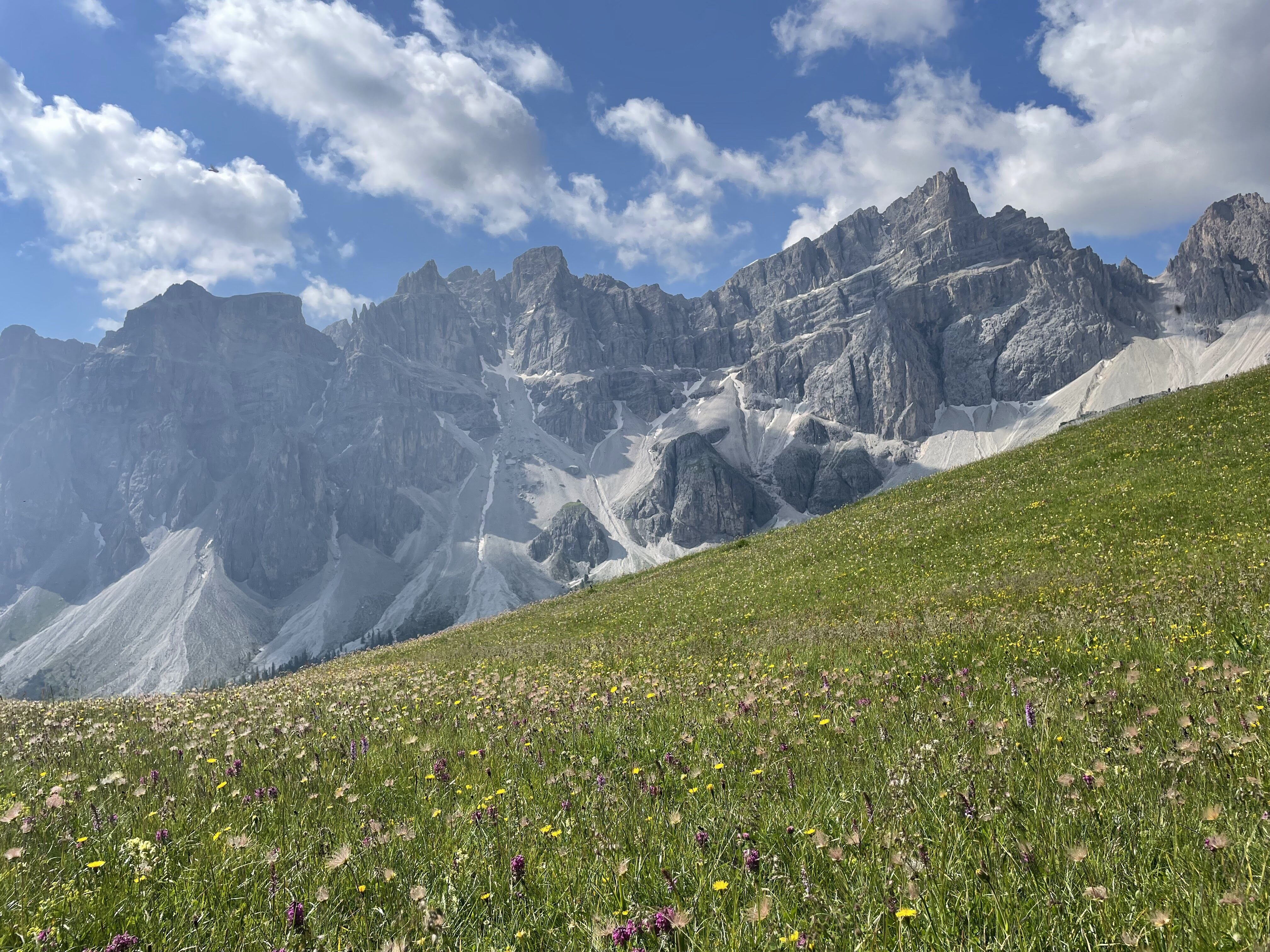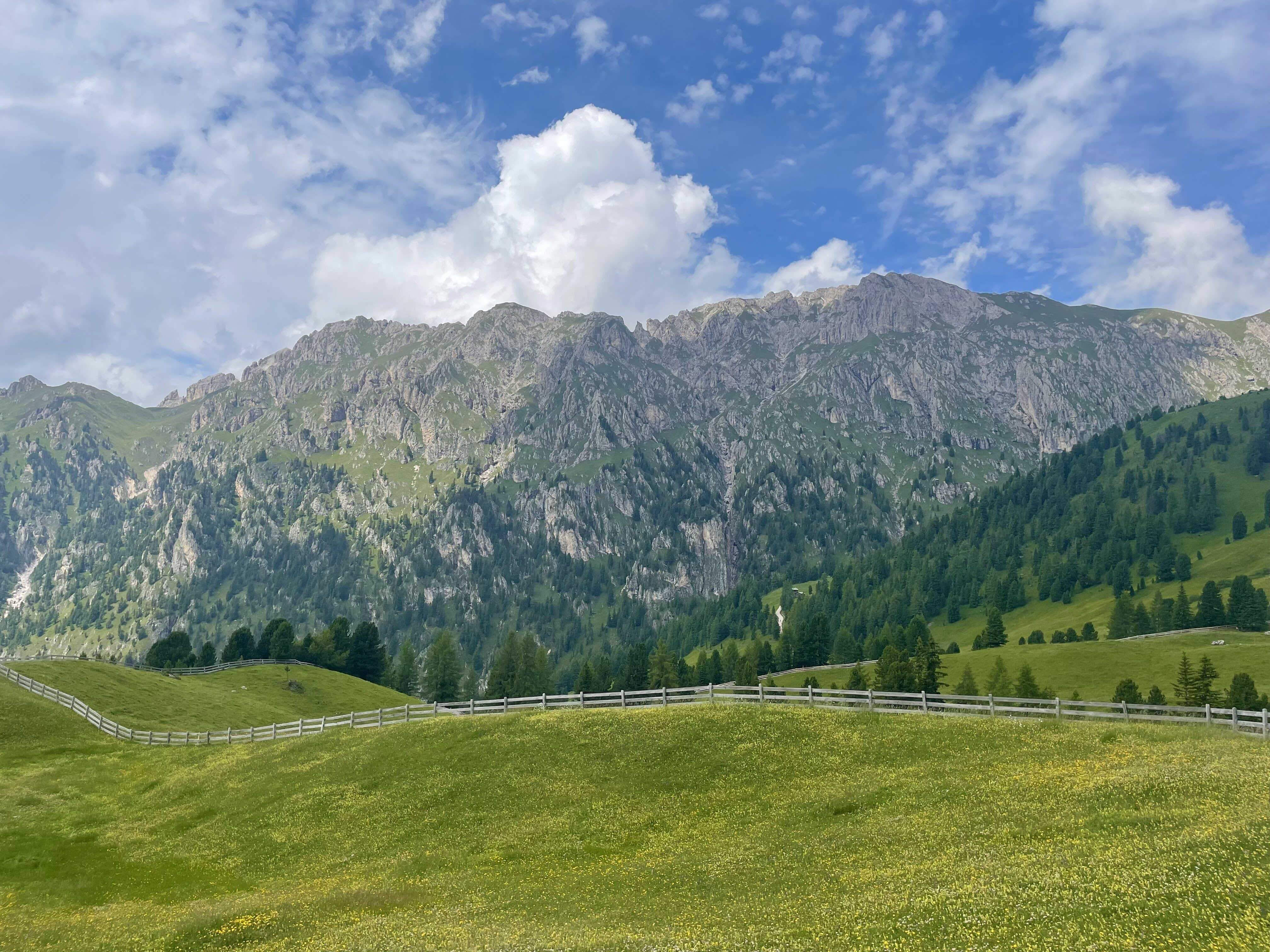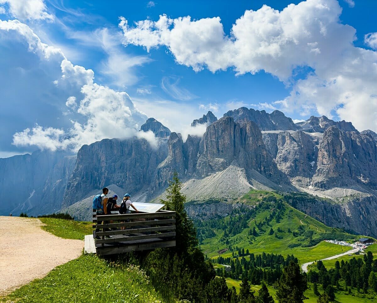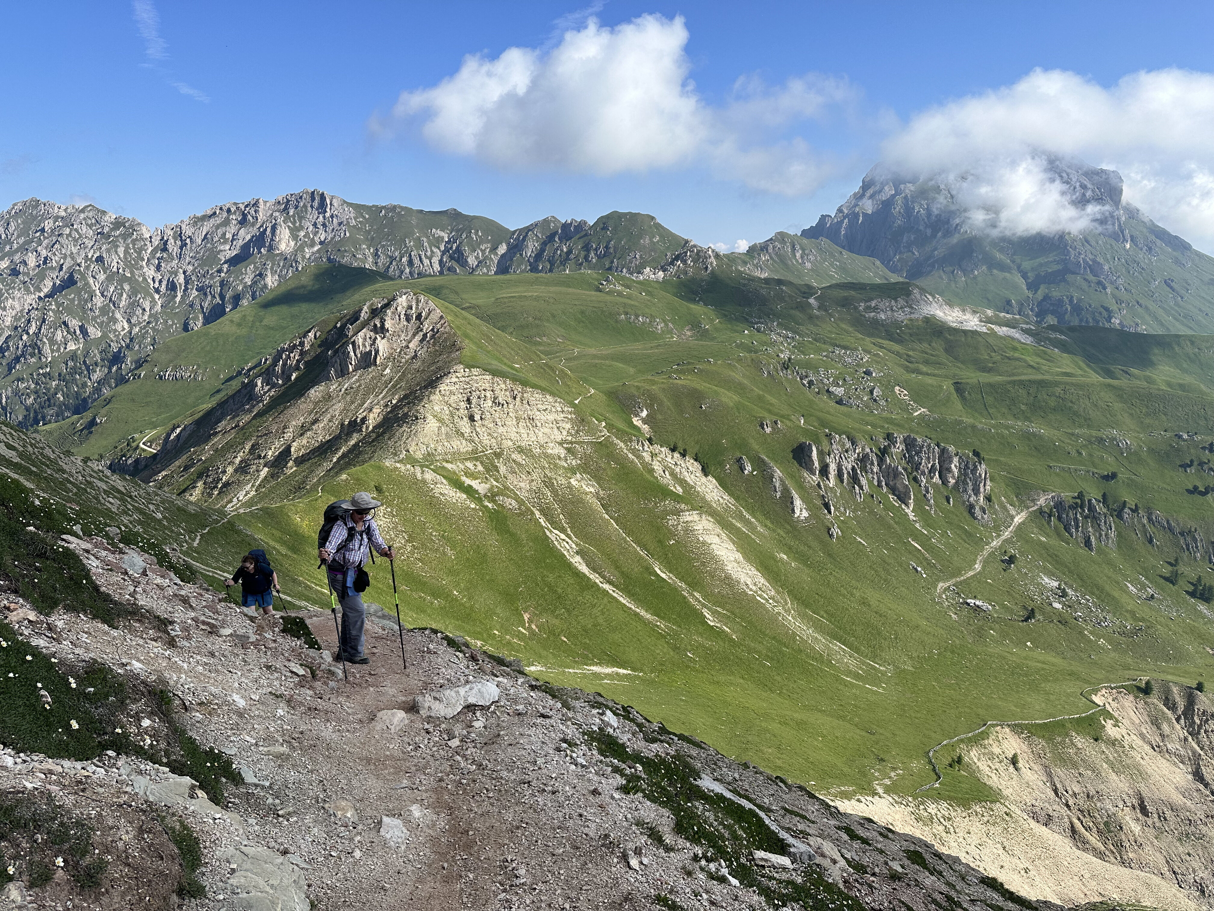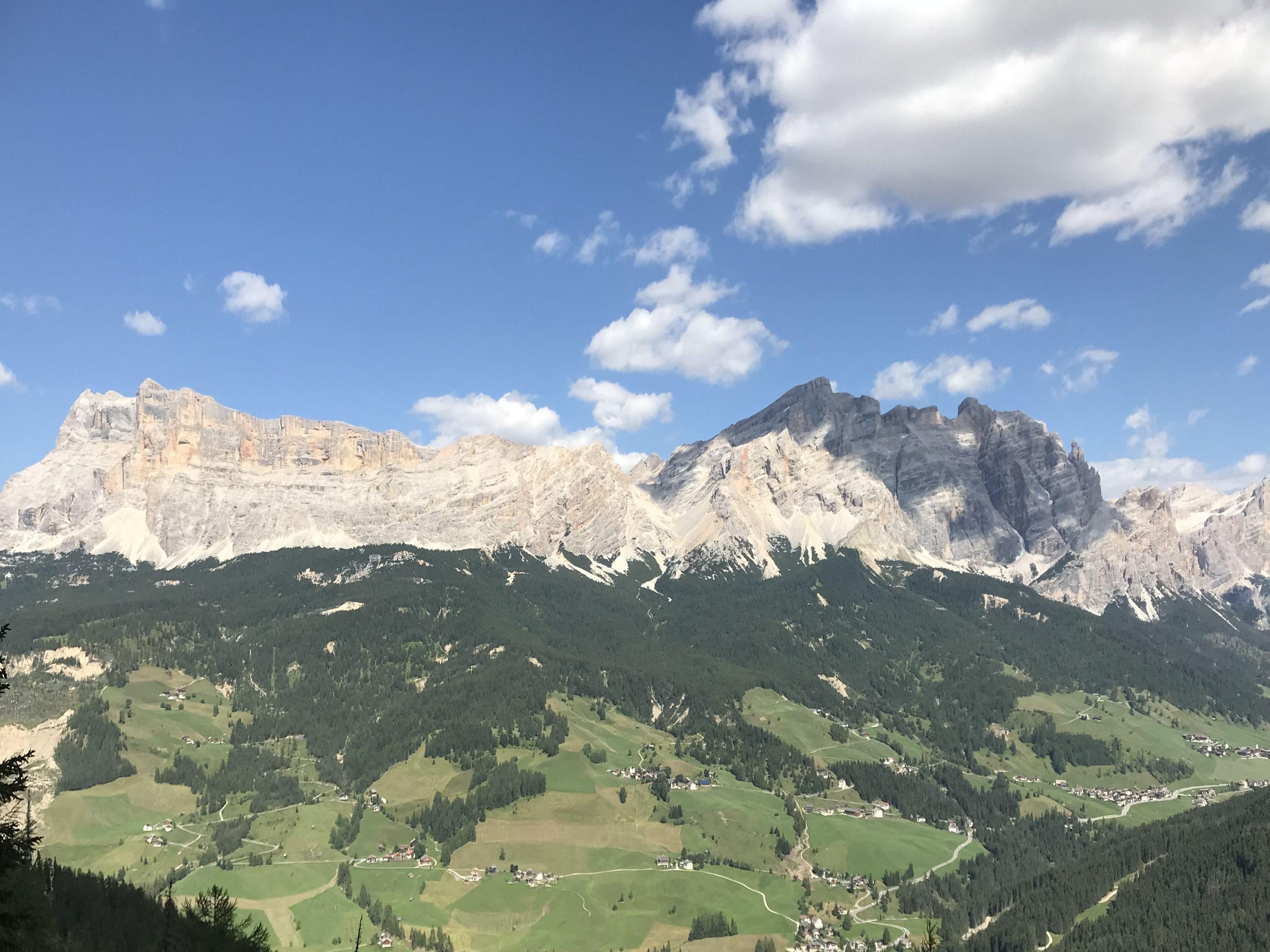 Today we hike below the dramatic southern face of the Odle massif, and enjoy huge views across the valley to the soaring pinnacles of the Sasso Lungo. Our hike takes us gradually down towards the village of Selva. Along the way we stop for a coffee and a strudel at rifugio Firenze before continuing down to the next rifugio for lunch where we look out over the lush green pastures and larch forests of the Val Gardena. The last knee destroying descent is avoided by a van pick up. We will be back in Ortisei in time to enjoy a gelato in the village square or a sauna at the hotel spa. Details: Total distance: 10.2 km (6 mi). Elev. gain 166m (531 ft) and loss 839m (2,684 ft). Hiking time: 3.5h Maximum altitude: 2,500 m (8,000 ft). Summary: Moderate hiking. Very good trails. Overnight Ortisei. Hotel, breakfast, lift ticket, and dinner included.