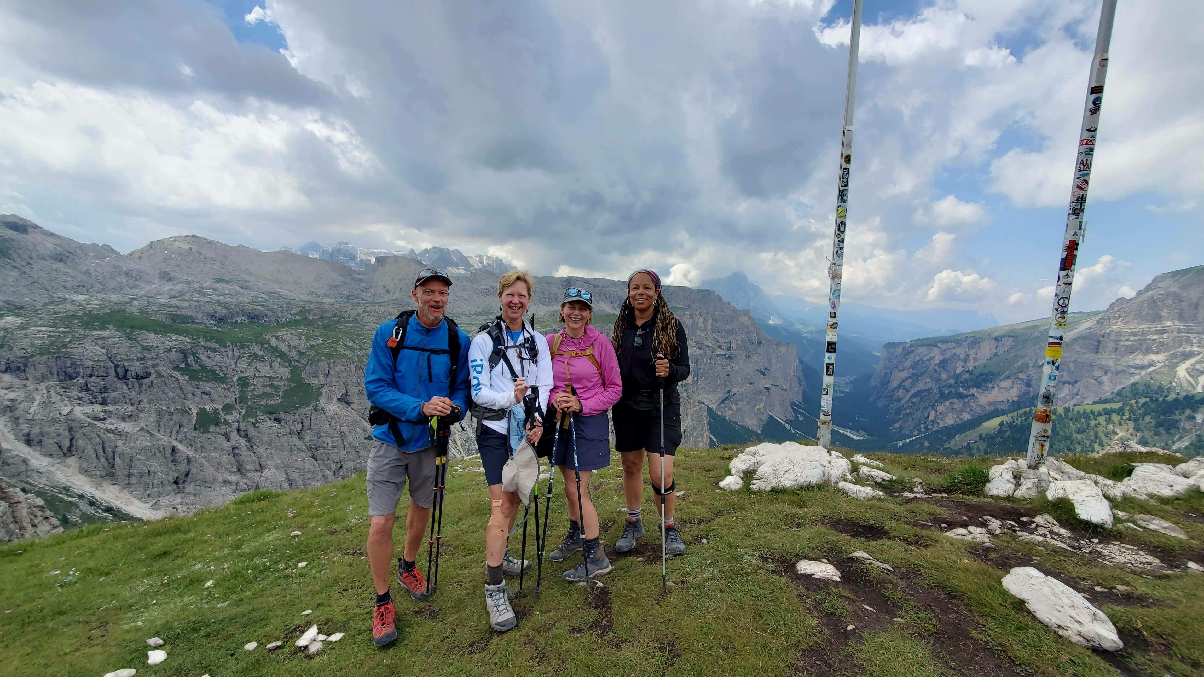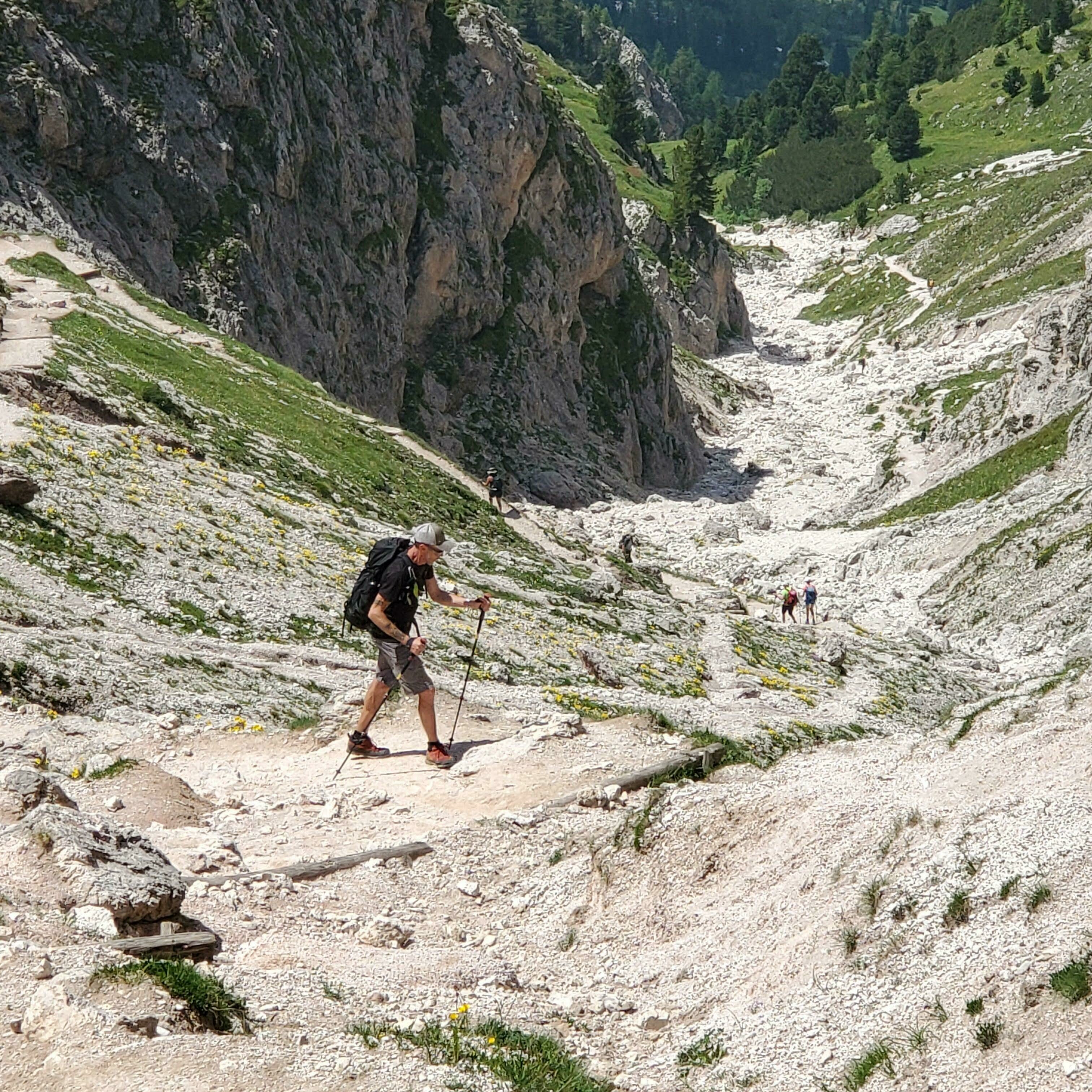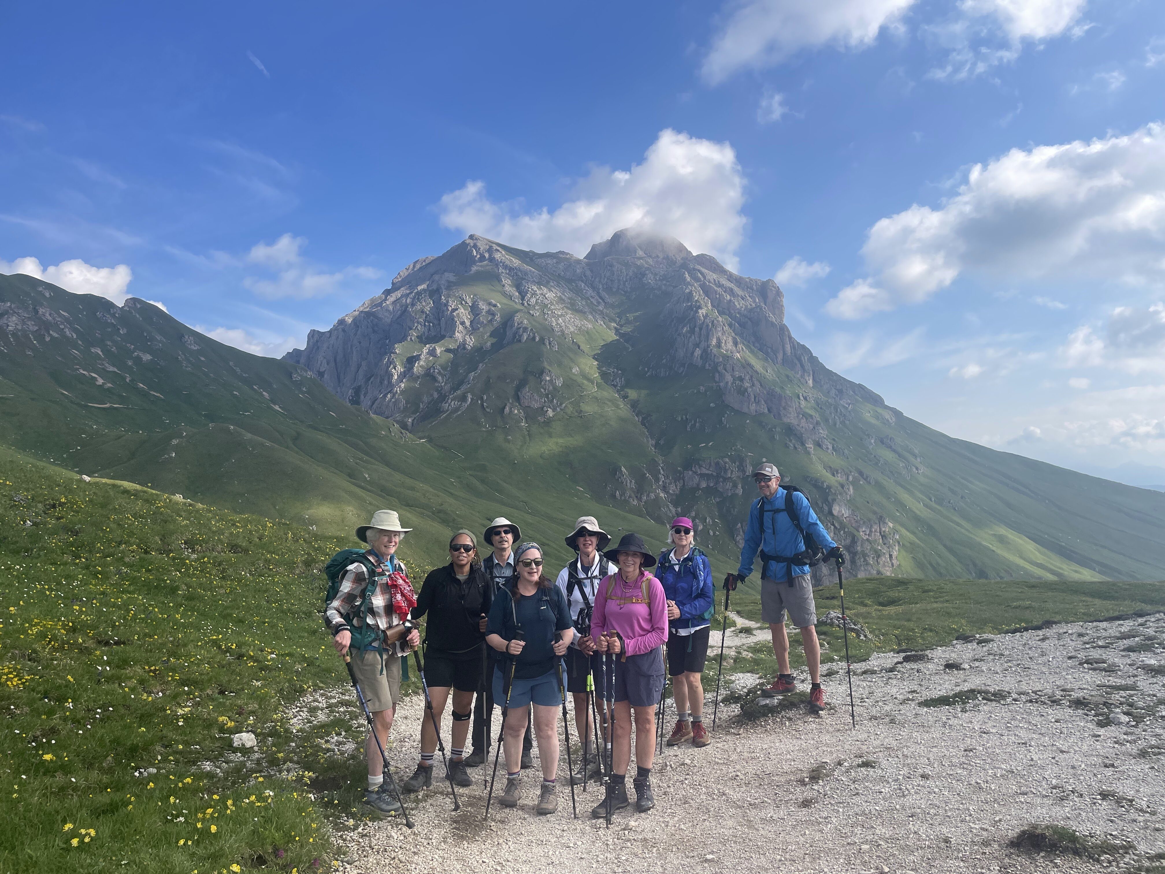 A 5 out of 5 rated tour is a tour that would be physically challenging and technically difficult even for very fit and experienced hikers. The hikes would have steep ascents and descents on narrow, exposed trails with challenging footing, such as on scree fields, or through rock falls and boulders. Distances would be up to 25 km/16 miles per day and feature ascents of over 1,000 m/3,200 feet in a day. A 5 out of 5 tour would also mean that you would be carrying a heavier-than-normal pack. None of our tours are rated 5 out 5. Our most challenging tours are 4.5 out of 5, and they are the Dolomites Alta Via (because of some exposed trail that requires some technical expertise) and our Republic of Georgia tour which has some long hikes with over 1,000 meters of elevation gain.