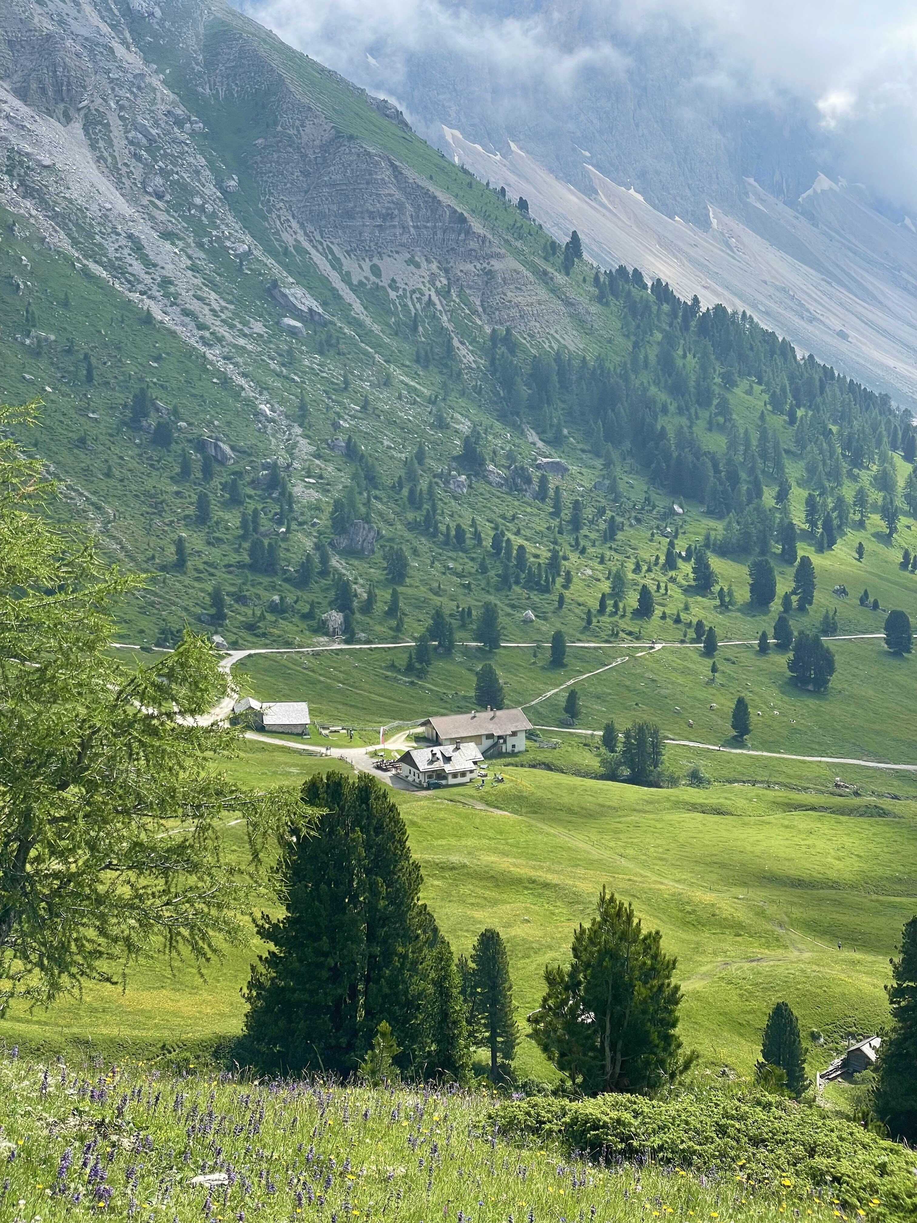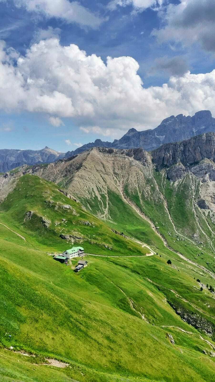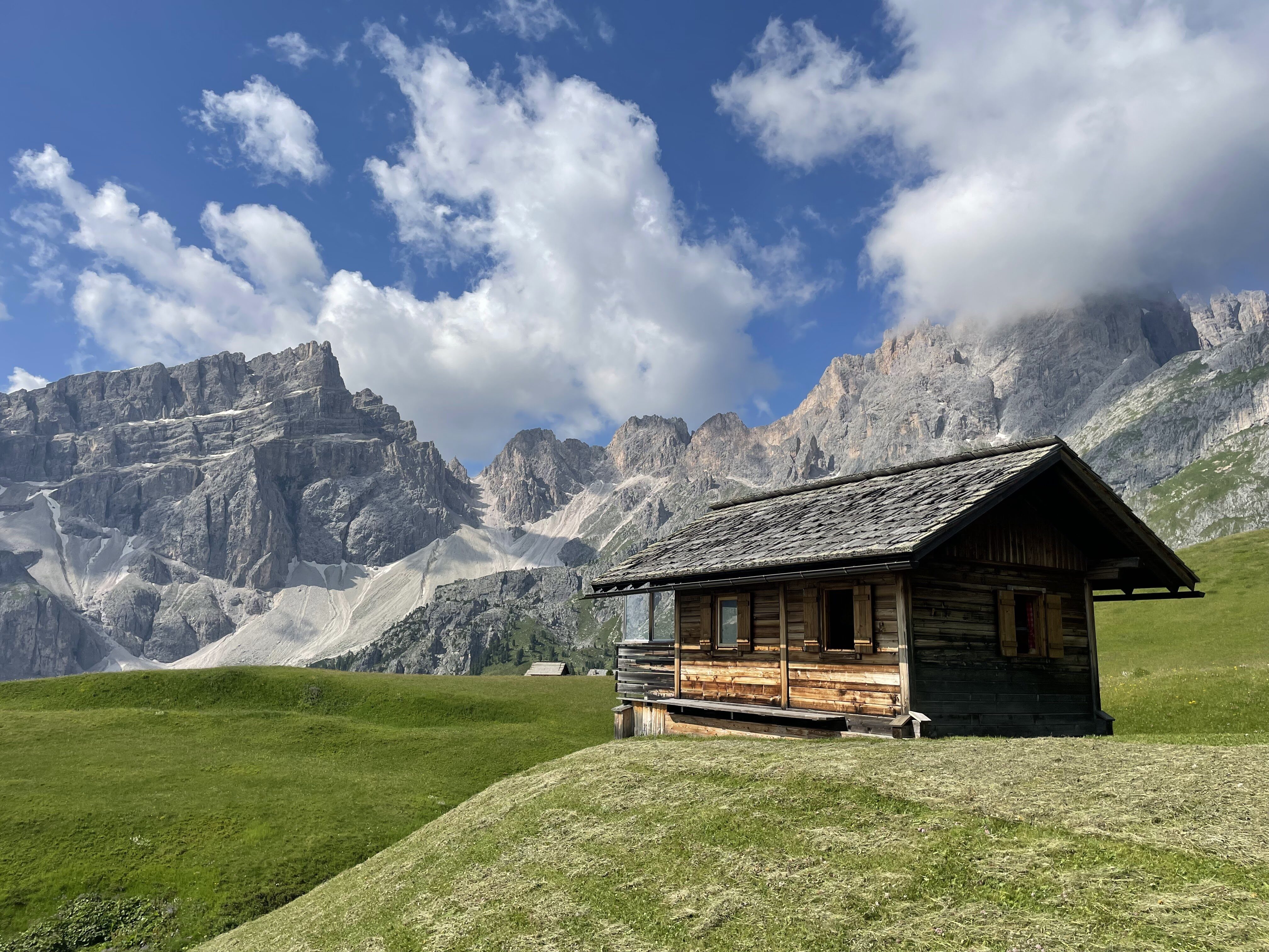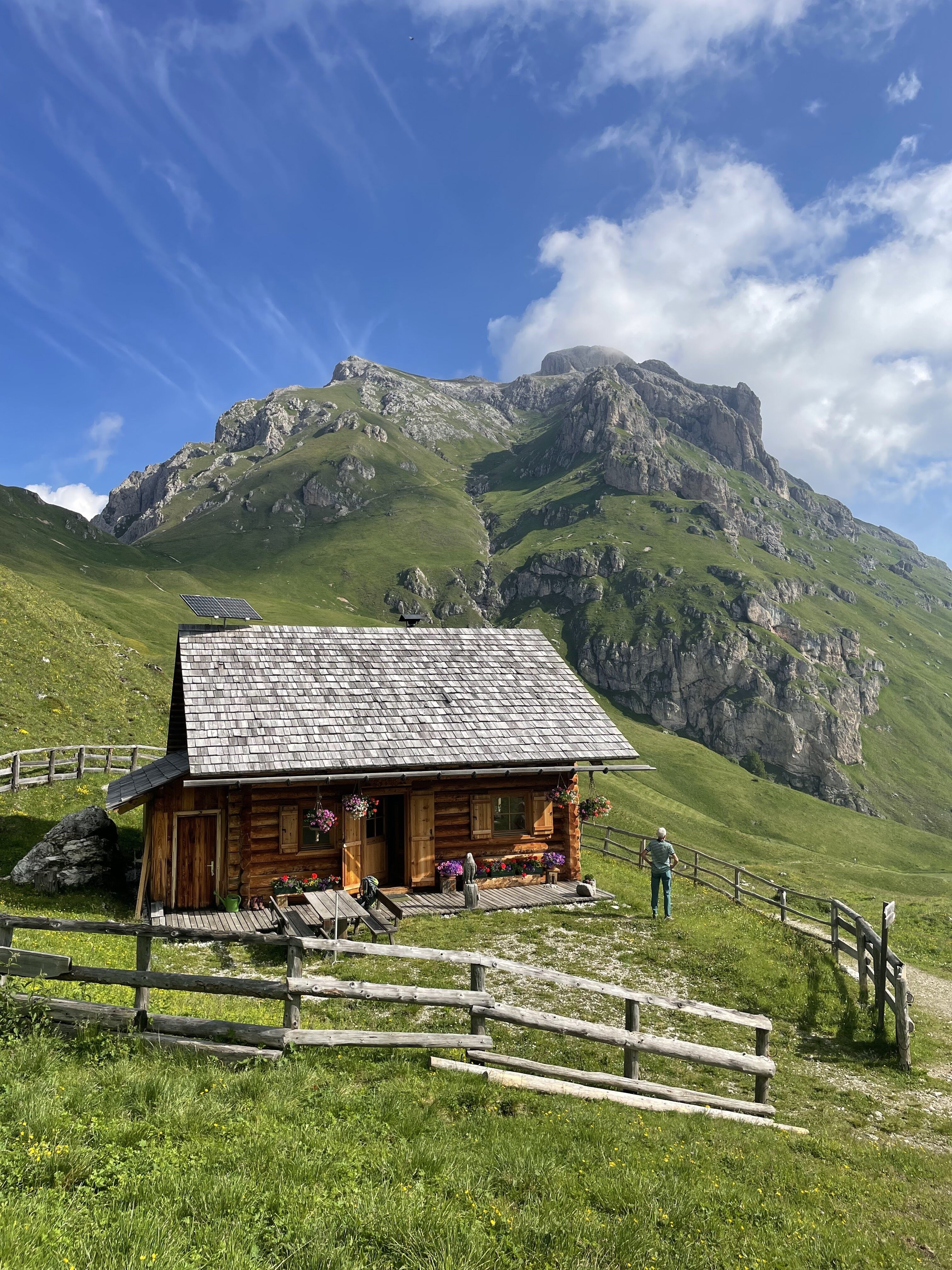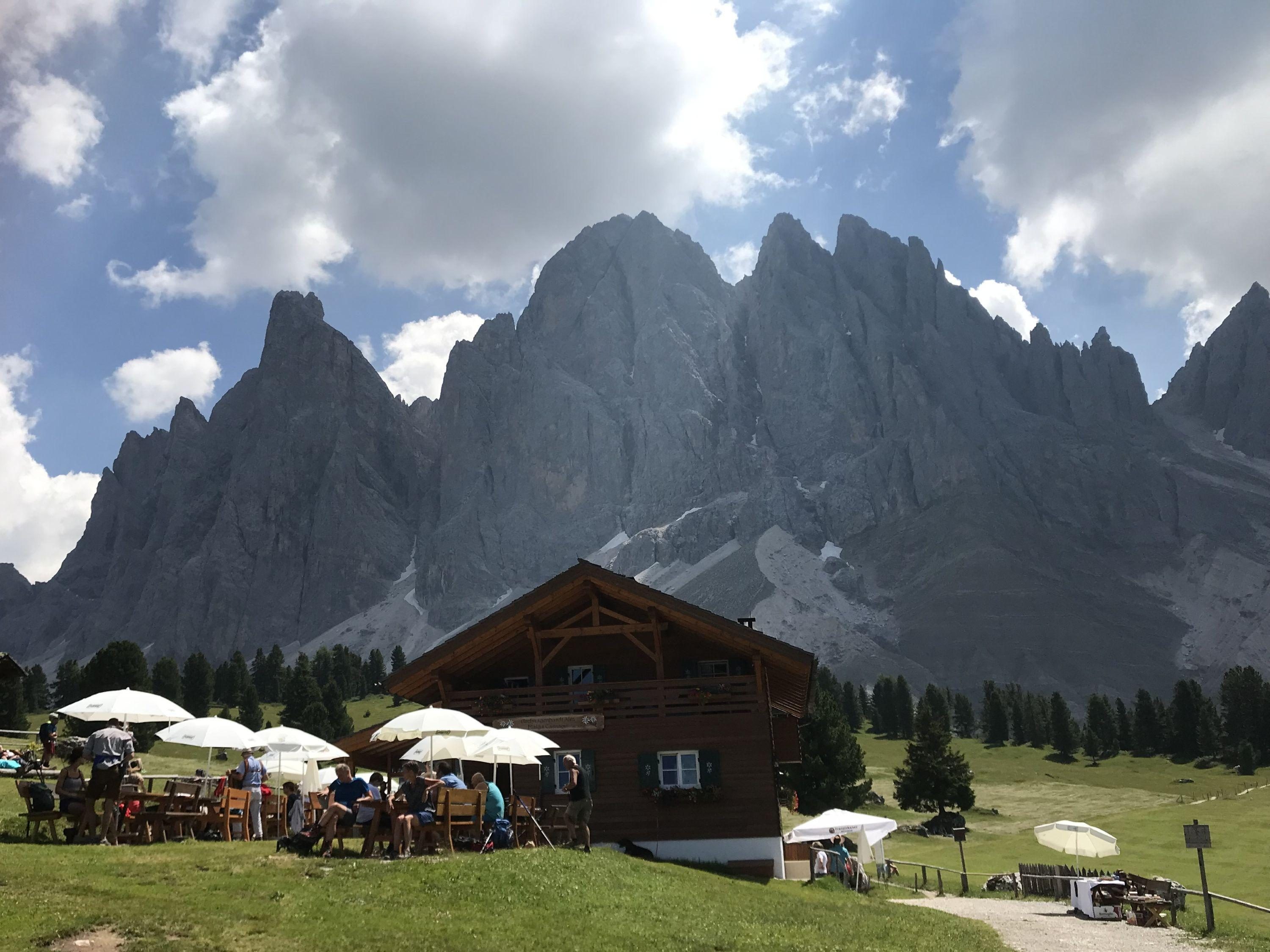 The trail leads us up towards a cathedral of soaring peaks. We crest a low pass and start to descend towards the valley. As we drop down the valley widens and is dotted with the traditional “baita” huts used by generations of shepherds who bring their livestock to graze the high pastures. We eventually arrive at a small hamlet where we are picked up and taken to La Villa village where we have lunch in a fabulous little pizzeria! Afterwards, we take a chair lift back up into the mountains for a 1 hour hike up to Rifugio Gardenaccia. Built in 1937, this family owned rifugio has retained all its old-world charm while enjoying the benefits of a recent renovation which includes a superb sauna. It’s a great way to relax at the end of a wonderful hike. Overnight in private double rooms (late sign-ups may have to share a triple or quadruple). The shower and WC are down the hall but we also offer you a free sauna so you can use the accompanying modern shower facility. Details: Total distance: about 11 km (6.3 mi). Elev. gain 440 m (1,408 ft) and loss 1002m (3,200 ft). Hiking time: 4.5 hrs. Maximum altitude: 2,440 m (7,808 ft). Summary: After a short climb, the morning is mostly gradual downhill to the pickup point. 1 hour climb after lunch. Good trails. Breakfast, dinner, and rifugio accommodation with sauna facilities included.